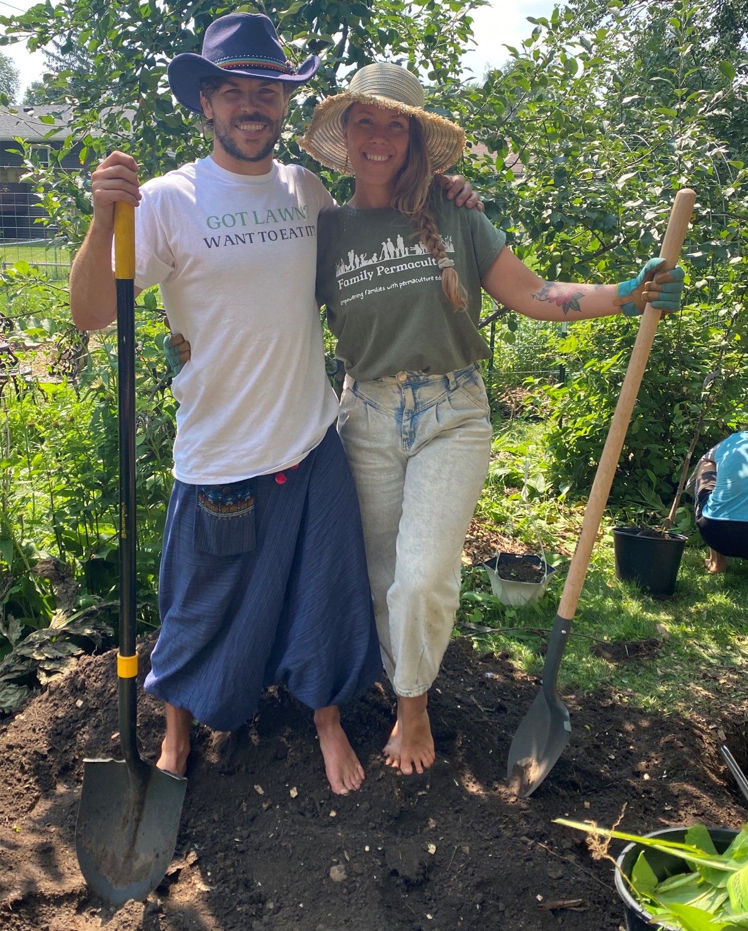 “After a couple years of extremes, our front lawn was dying. We knew that the monoculture we were trying to keep alive wasn’t an efficient use of our time and water resources, so we were ready to convert to a more resilient design. Alex at PermaCulture Party helped us build a plan to transform our front yard into a food forest and native pollinator garden. We garden frequently and weren’t afraid of getting our hands dirty, but wanted an extra set of eyes and some deeper knowledge of native varieties to ensure we were maximizing our space. To kick off our project, Alex also helped us host a permaculture party and plant the first section of our “yarden” with family, music, fun and great food. It was a hit! Thanks, Alex."